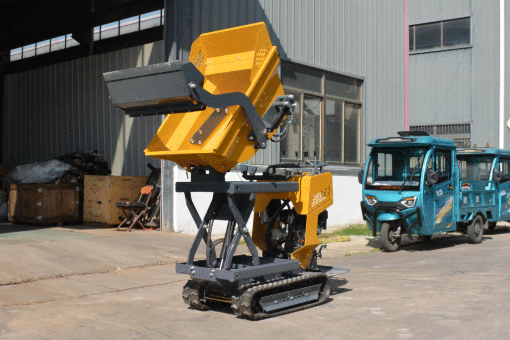A Chinese mini dumper is simply a small material-carrying dumper made by a manufacturer in China. It’s not one special design. It’s a category that covers lots of models: tracked, wheeled, walk-behind, ride-on, gasoline, diesel, and electric.
